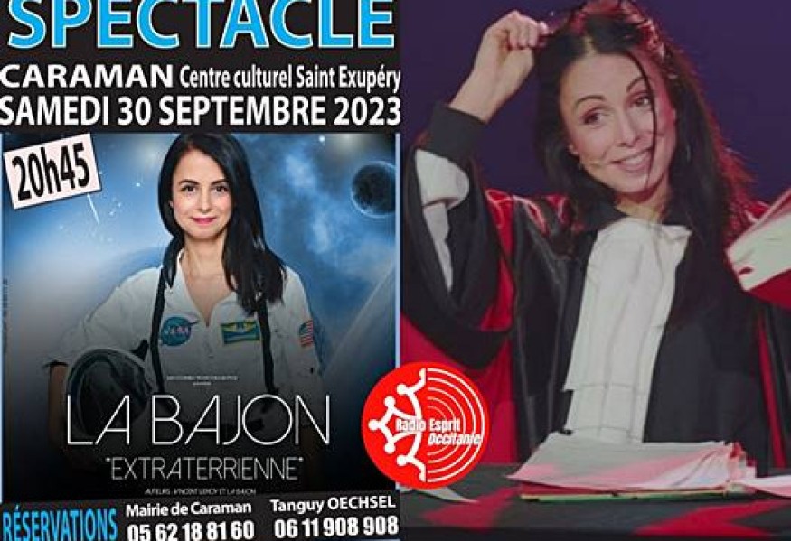 Après avoir fait salle comble au casino barrière, La Bajon revient ce vendredi 30 septembre à 20h45 à Caraman juste à côté de Toulouse avec son humour percutant qui fait du bien. On parle avec elle des vidéos Youtube avec le personnage de la juge qui fait partie de son spectacle. Embarquez avec La Bajon dans Extraterrienne". Vos zygomatiques ne seront pas déçus du voyage ! Réservez vite vos place !