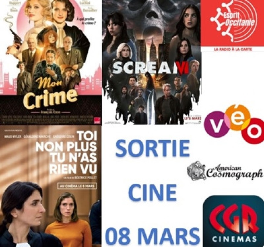 Pour la sortie cinéma du 08 mars, la journée de la femme, nous vous invitons à découvrir dans les salles les films suivants : « Mon crime » qui nous plonge dans les années 1920 de manière magistrale et théâtrale avec l’incroyable duo féminin de Rebecca Marder et Nadia Tereszkiewicz, suivi de « Scream VI » nouvel opus de la saga d’horreur mythique et enfin « Toi non plus tu n'as rien vu » à la recherche de la vérité. Vos avis sont aussi au rendez-vous.