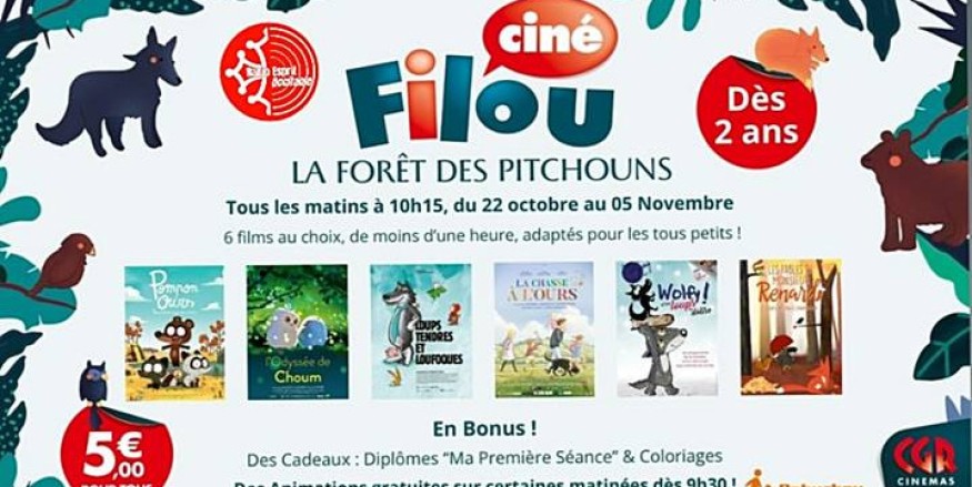 Pour sa deuxième année, Ciné-Filou fait son retour durant les vacances de la Toussaint du samedi 21 octobre au dimanche 05 novembre au cinéma CGR Blagnac. Ciné-Filou a été mis en place l’année dernière par le directeur du CGR Blagnac pour faire découvrir aux tout petits à partir de 2 ans, lors des différentes vacances scolaires, les joies du cinéma. Découvrir pour la première fois un film sur grand écran adapté à son âge et d’une durée de moins d’une heure. Tous les matins à 10h15 le cinéma ouvrent ses portes avec pas moins de six films sous le thème de « La forêt des Pitchouns » les animaux de la forêt.