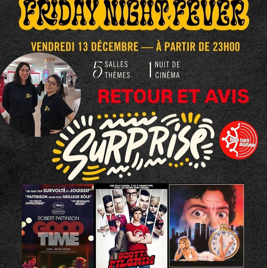 Le vendredi 13 décembre avait lieu la Friday Night Fever 2 au Pathé Wilson. L'évènement a été créé par Marion Calzetta et Sofia Douad. De 23h à 05h30, 5 salles, 5 thèmes : Feel good, Horreur, Cinéma Asiatique, Science Fantasy, et Surprise ! Une nuit en thème surprise avec 3 films, une collation, une visite des cabines de projection du café à volonté et du partage avec d'autres spectateurs et spectatrices dont Mélina et Alice notre fil rouge avis tout au long cette nuit au cinéma.